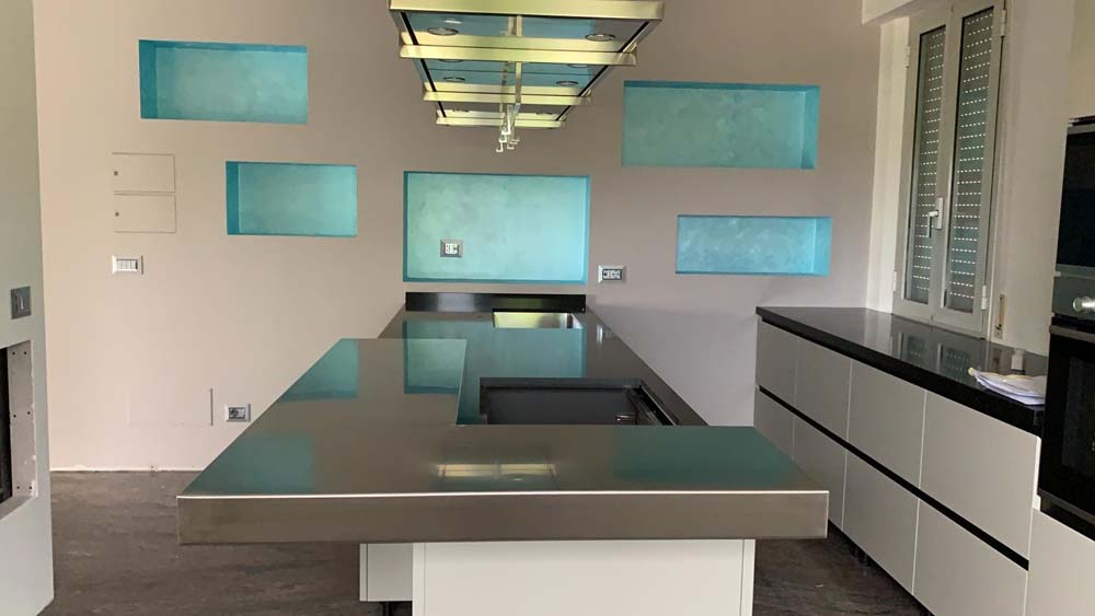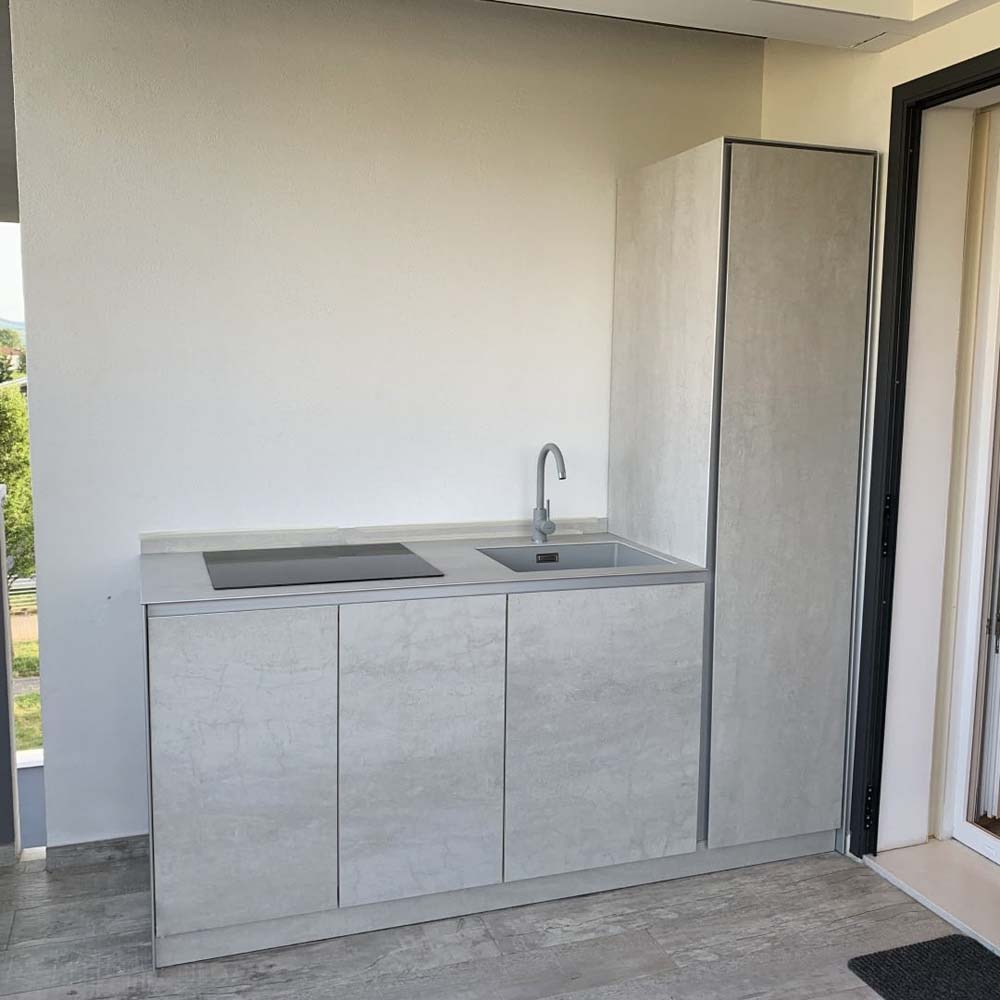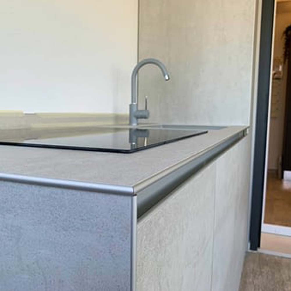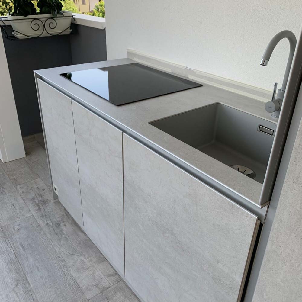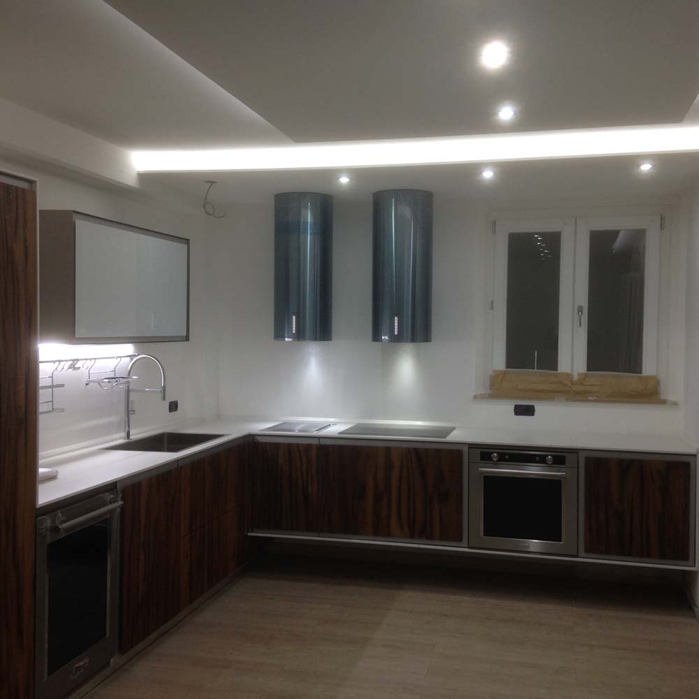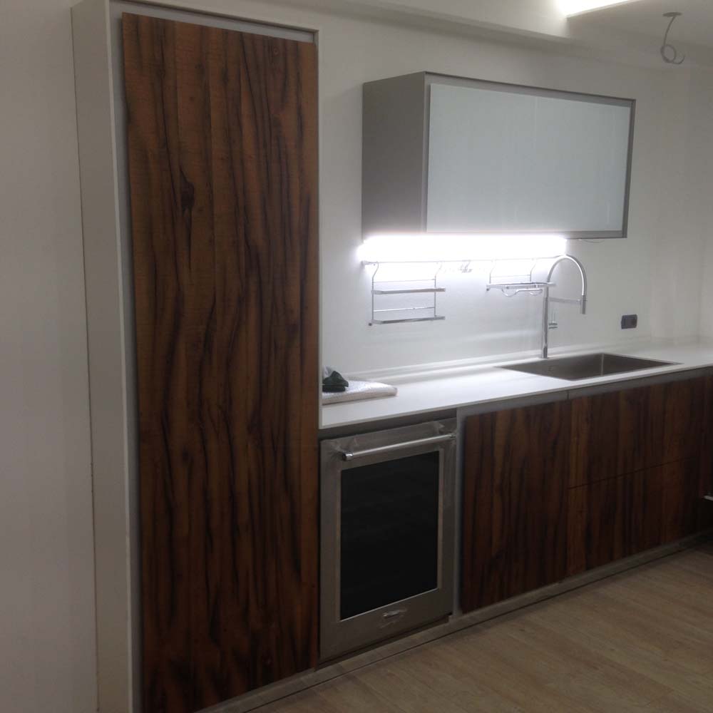 Diverse tipologie di oggetti con lo stesso materiale della cucina agli armadi dal soffitto alle pareti e mobili contenitori.