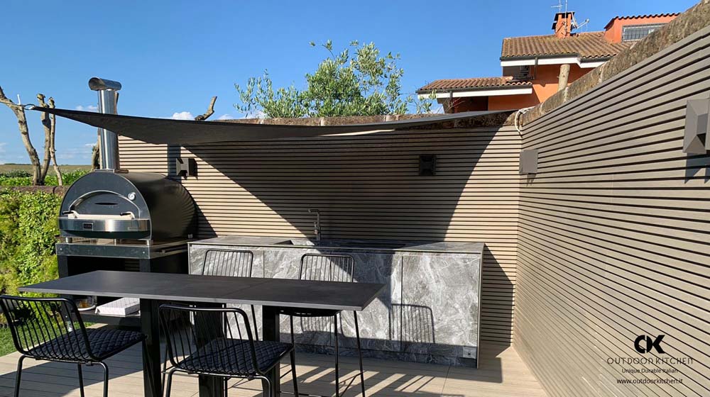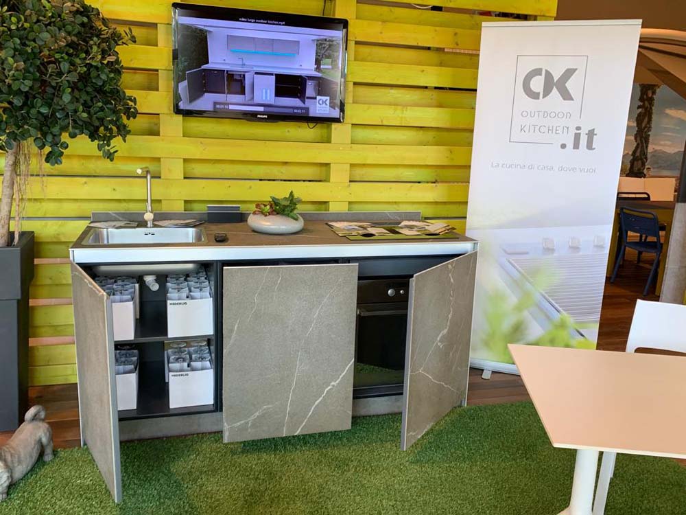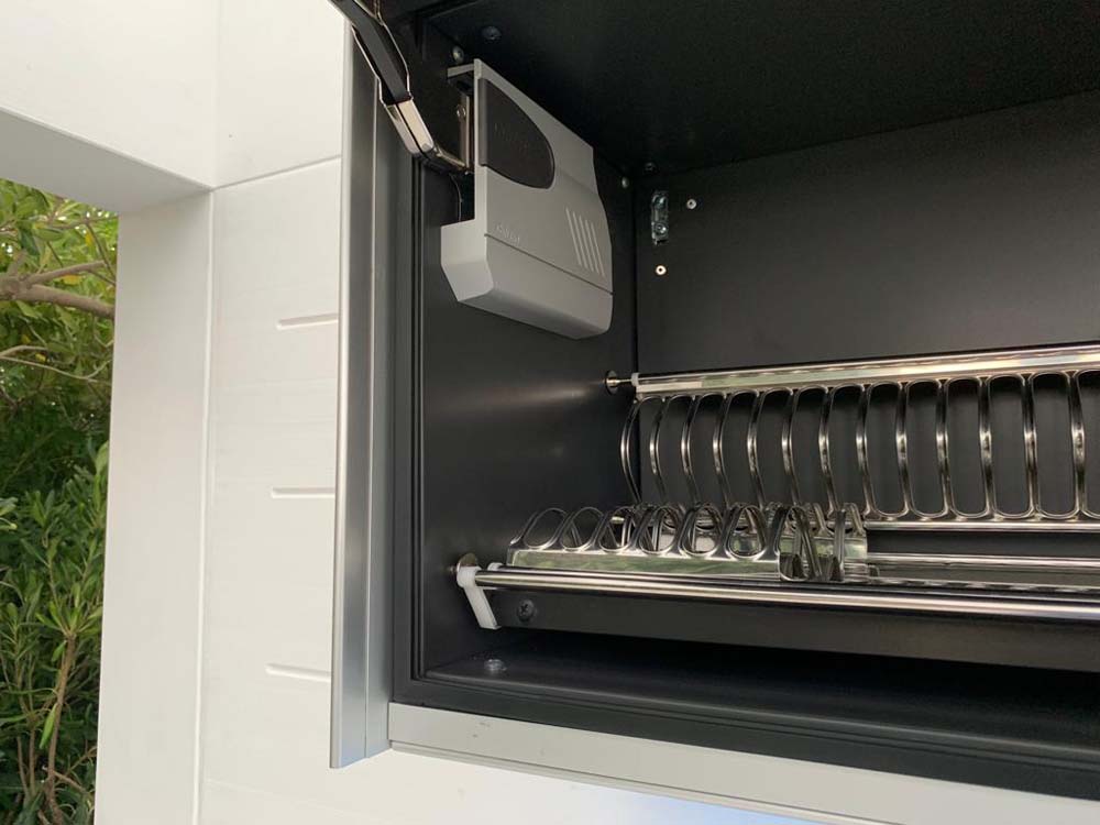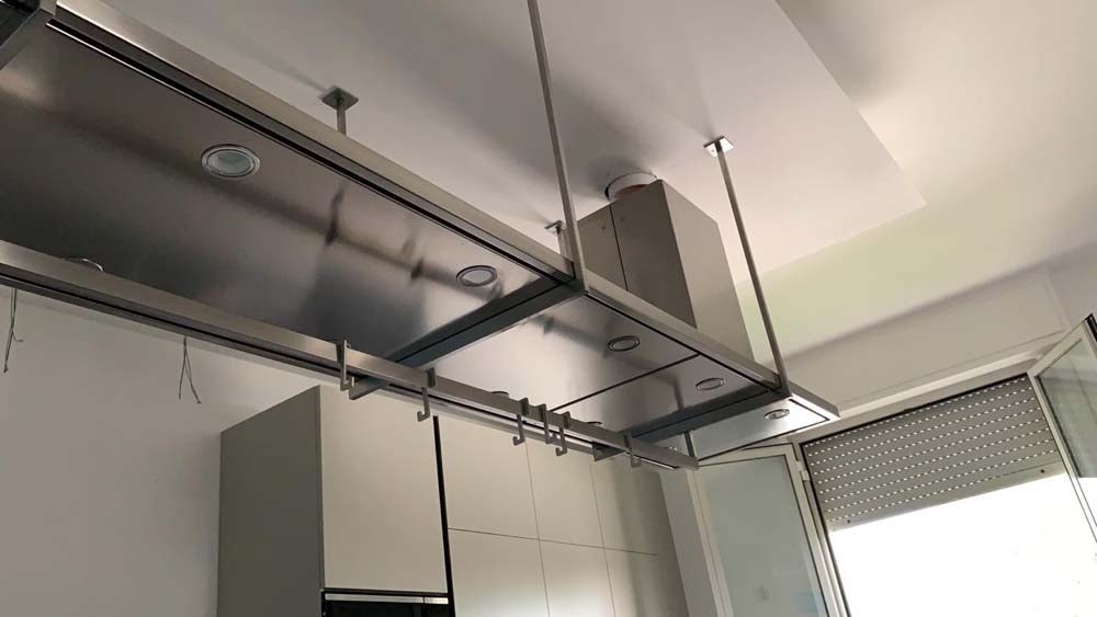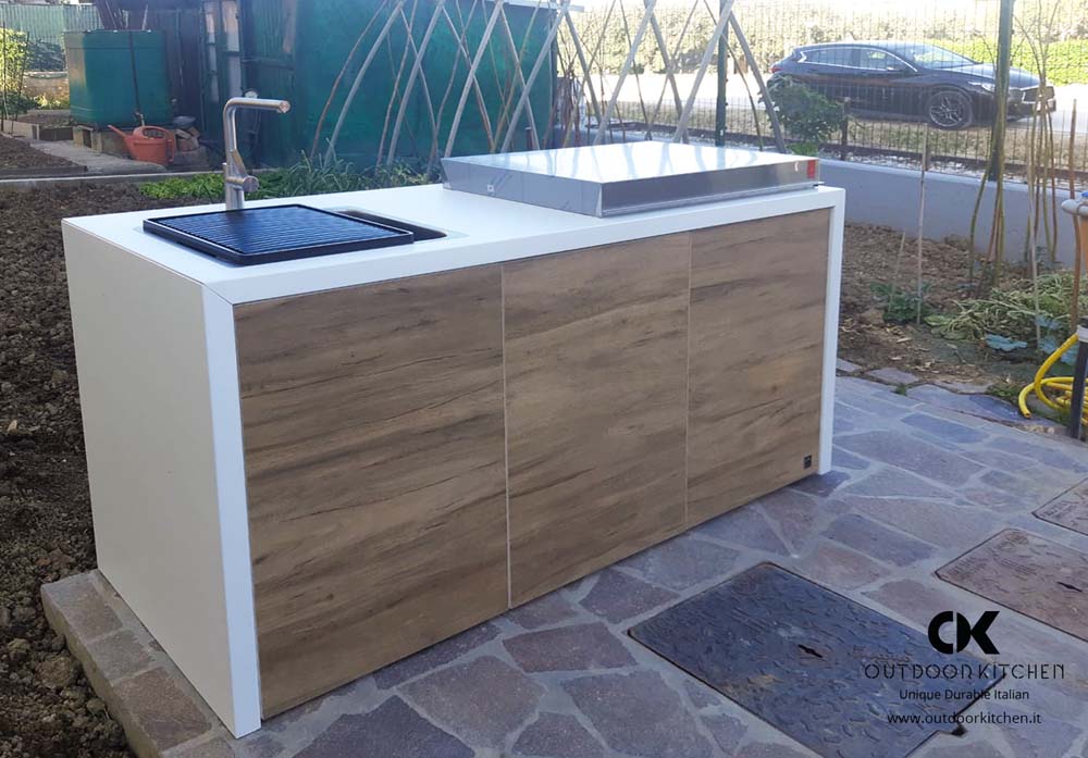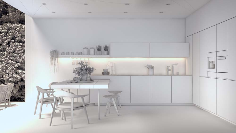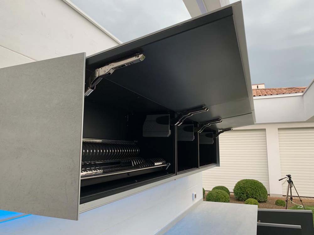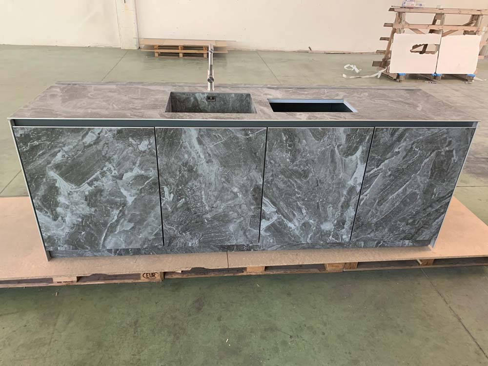 Diverse tipologie di oggetti con lo stesso materiale della cucina agli armadi dal soffitto alle pareti e mobili contenitori.