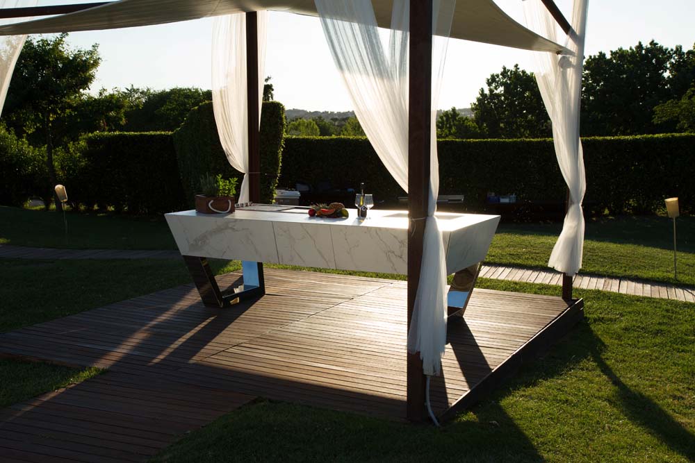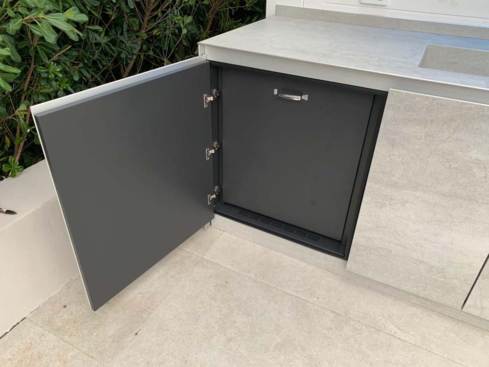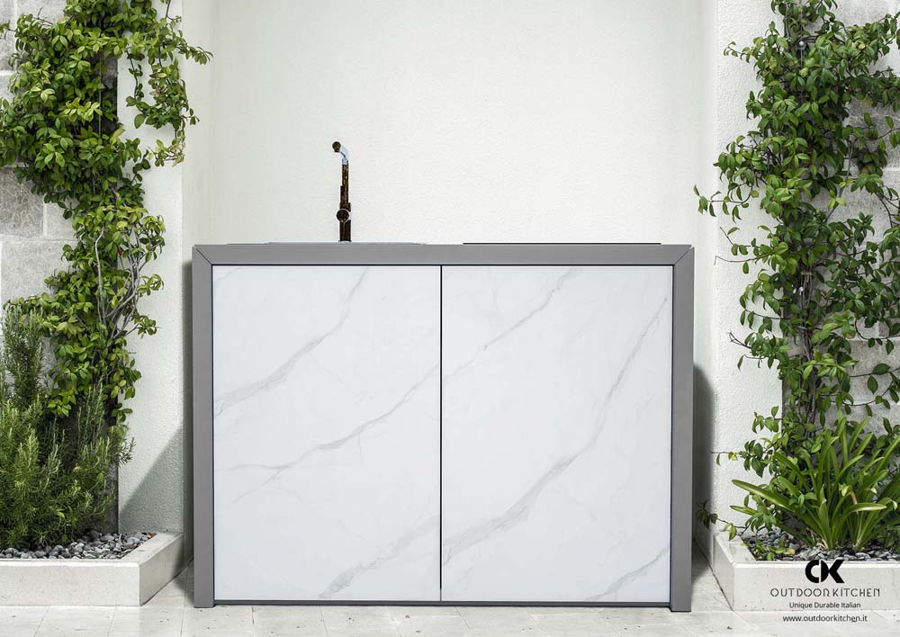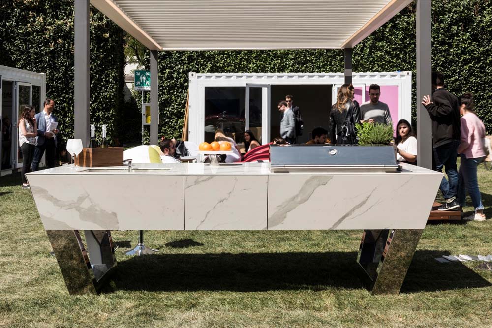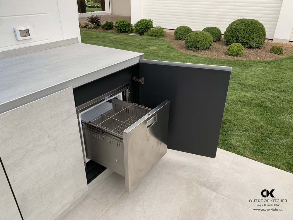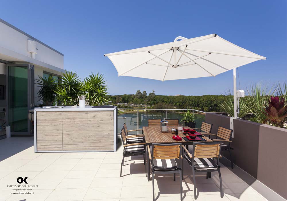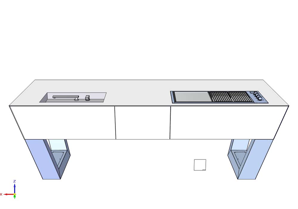Diverse tipologie di oggetti con lo stesso materiale della cucina agli armadi dal soffitto alle pareti e mobili contenitori.