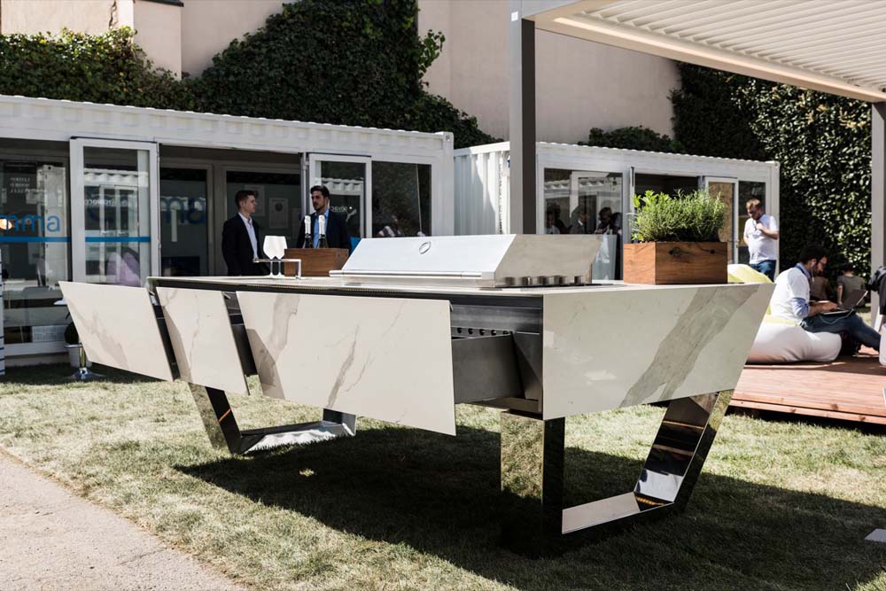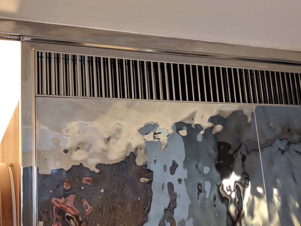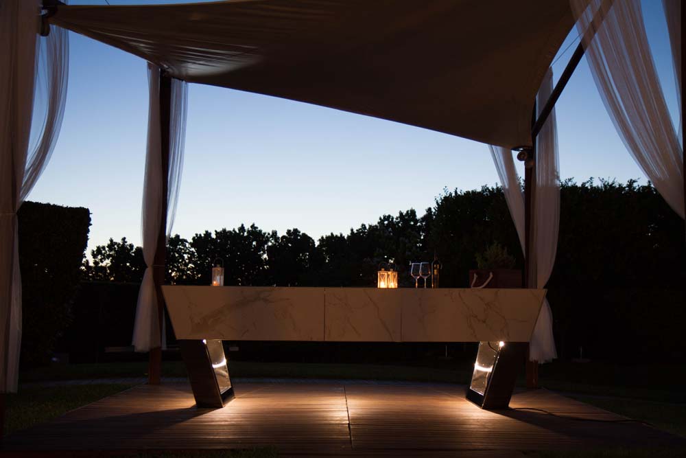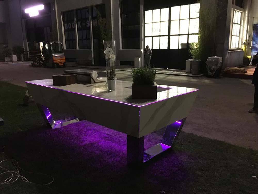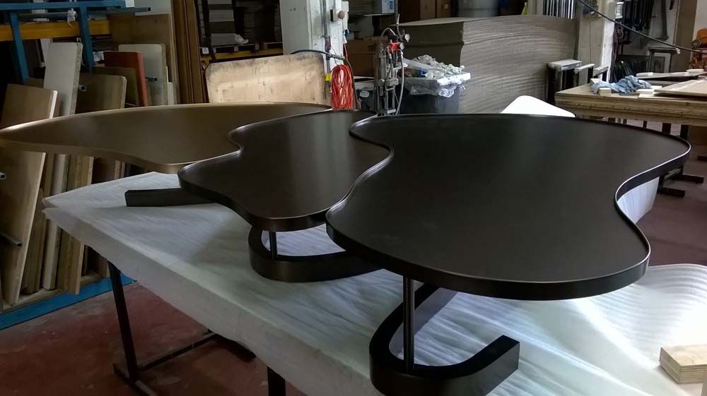 Acciaio inox martellato, legno, telaio in ferro verniciato